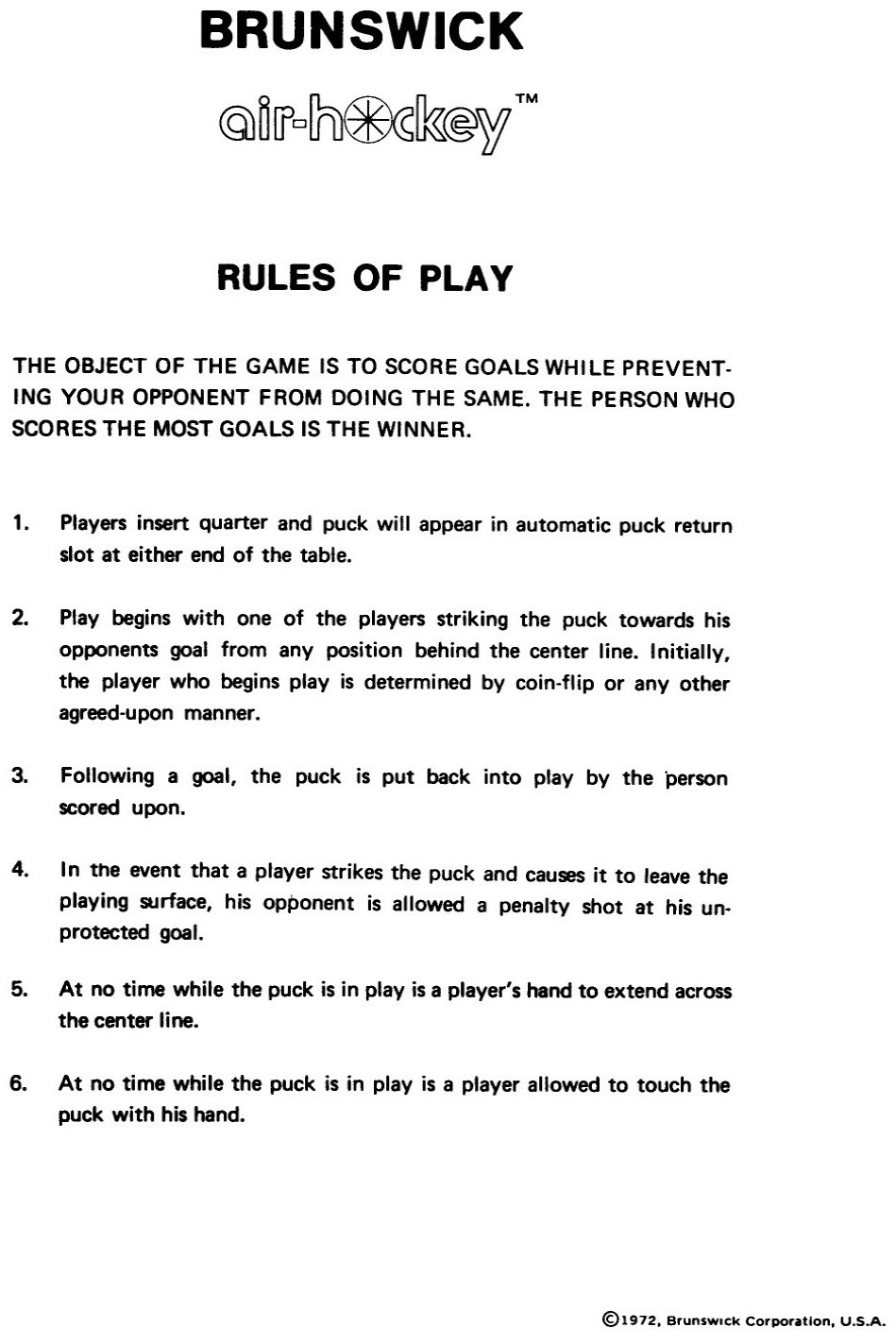 1. The first player to accumulate seven (7) points wins the game. 2. When the puck enters and drops inside a player's goal, the player's opponent receives one point (unless play had been suspended by the referee or the offensive player had committed a foul during or prior to the shot.) 3. After each game, players will alternate tablesides. 4. The player scored upon receives possession of the puck for the next serve. 5. A player may hand serve the puck only after it has entered his goal. 6. A player may play with only one mallet on the playing surface at one time. Violation results in a foul. 7. The puck may be struck with any part of the mallet. 8. The puck cannot be "topped" by lifting the mallet and placing it on the top of the puck. This cannot be done at any time whether before a serve or after a serve during play. Violation constitutes a foul. Using the mallet to bring an airborne puck to the table or opponent's goal is not a topping violation no matter which side or edge of the puck is contacted. 9. Only one puck may be in play at a given moment. 10. A player has seven (7) seconds to execute a shot, which crosses the centerline. The seven (7) seconds begins as soon as the puck enters and remains on that player's side of the centerline. Violation of this rule is a foul. 11. When the puck is in contact with any part of the centerline, either player may strike the puck. 12. A player may stand anywhere around the table on his/her side of the centerline. He/she may not stand past that line. 13. If any part of a player's hand, arm, body, or clothes touches the puck, "palming" will be called by the referee, which constitutes a foul. 14. Each player may take one time-out per game. The time-out may be no longer than 10 seconds. 15. A player may exercise his/her time-out only when the puck is in his/her possession or not in play.